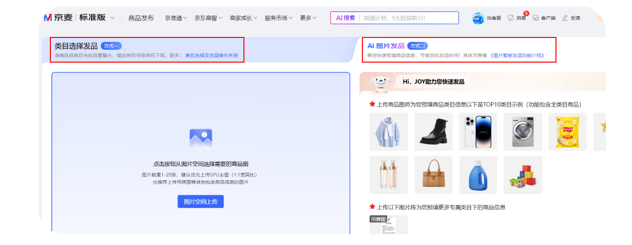 商品发布分为【类目选择发品】和【AI图片发品】2种方式