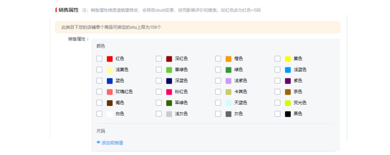 多sku发布需在销售属性中添加/修改,“颜色”及“尺码”字样为默认不可修改