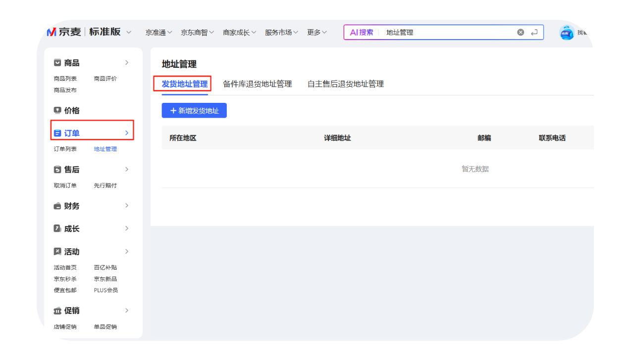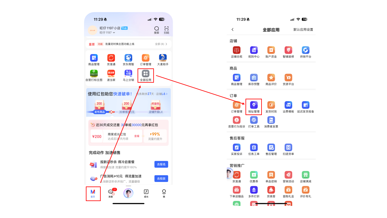 路径①:直达链接:https://shop.jd.com/jdm/trade/delivery/addressManage