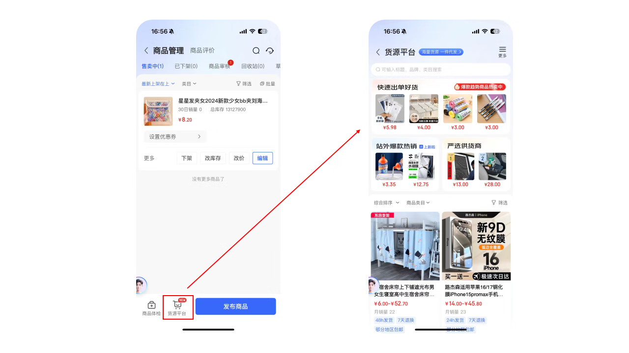 3、货源推荐功能(无货源店铺可找货源)